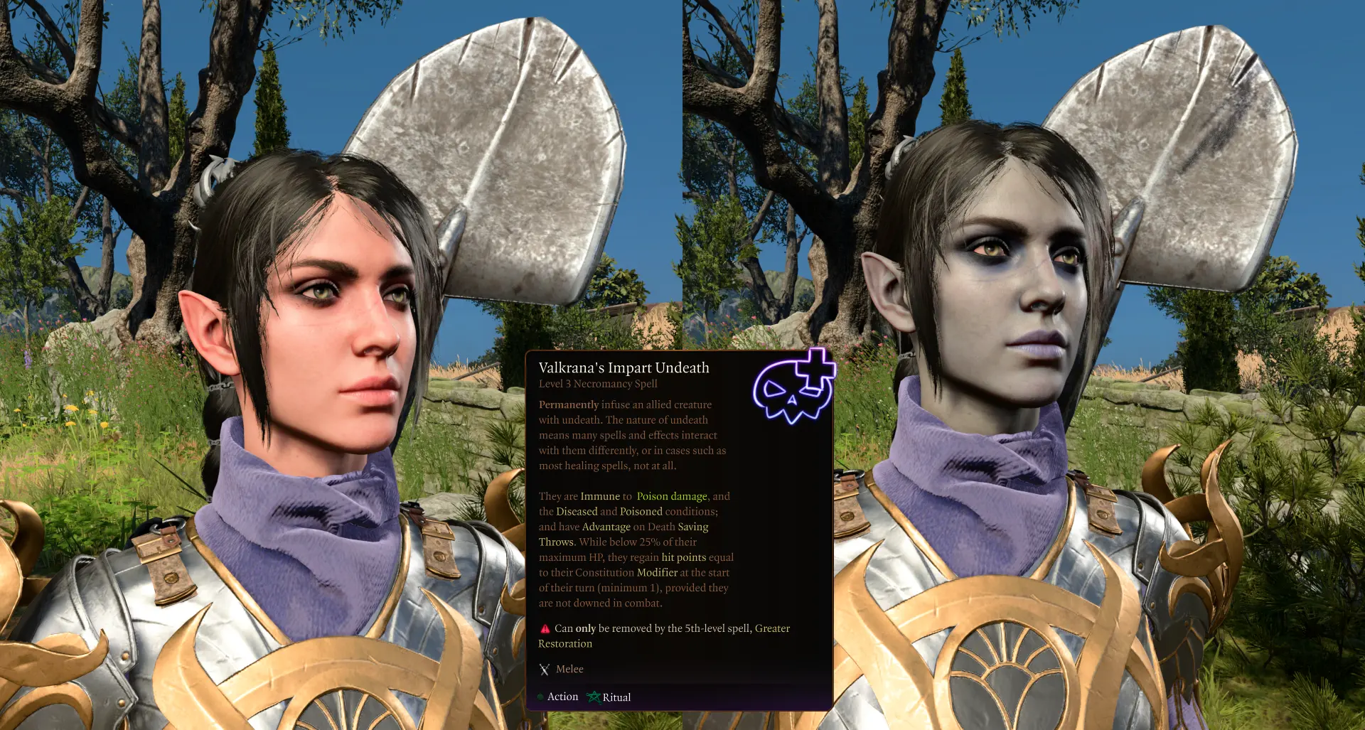 Description: Infuse an allied creature with undeath. The nature of undeath means many spells and effects interact with you differently, or in cases such as most healing spells, not at all. You are immune to poison damage, and the diseased and poisoned conditions; and have advantage on death saving throws. While below 25% of your maximum HP, you regain hit points equal to your Constitution modifier at the start of your turn (minimum 1), provided you are not downed in combat. Can only be removed by Greater Restoration. Will alter a character's appearance if SE is installed.