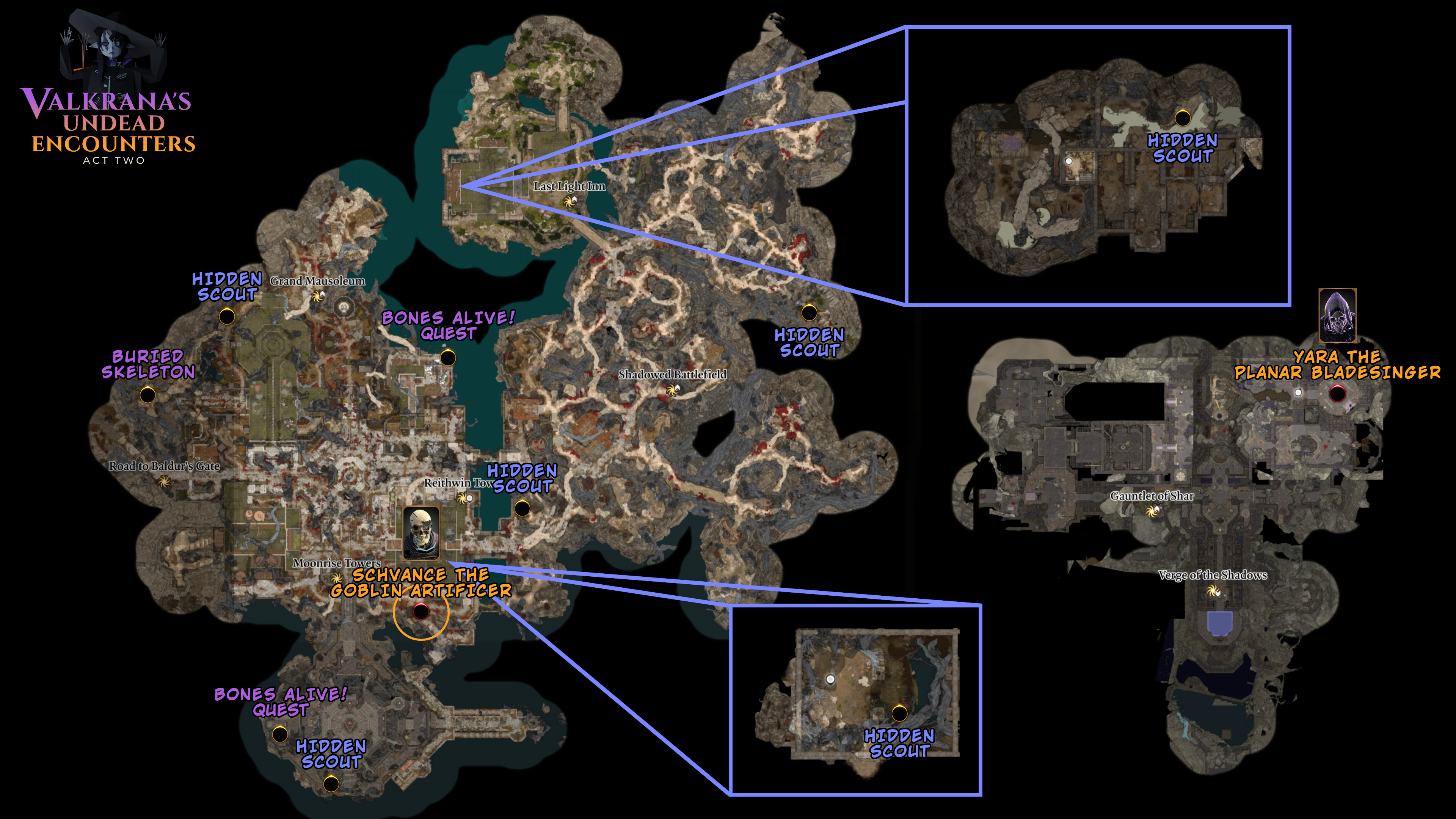 6. Shadow-Cursed Lands, Map-wide exploration, X: 321 Y: -720, X: 130 Y: 65, X: -226 Y: 64, X: 43 Y: -749, X: -43 Y: -56, X: -163 Y: -223 — 6 hidden entities. When 5 are found, encounter follows. Drops the Necrobroker's Pall cloak. Requires Valkrana's Necrobroker.